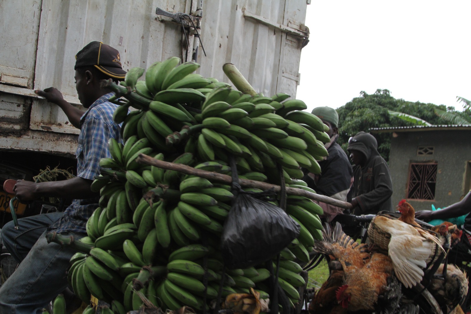 Mwanamume akiwa amebeba ndizi kuelekea mji wa kibiashara wa Bujumbura kwa baiskeli, akining’inia kwenye lori kutoka mkoa wa Kayanza (SOS Media Burundi)