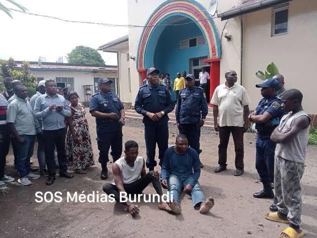 Photo : assis par terre, les deux présumés auteurs du meurtre d’Edmond Bahati présentés à la presse par les services congolais © SOS Médias Burundi