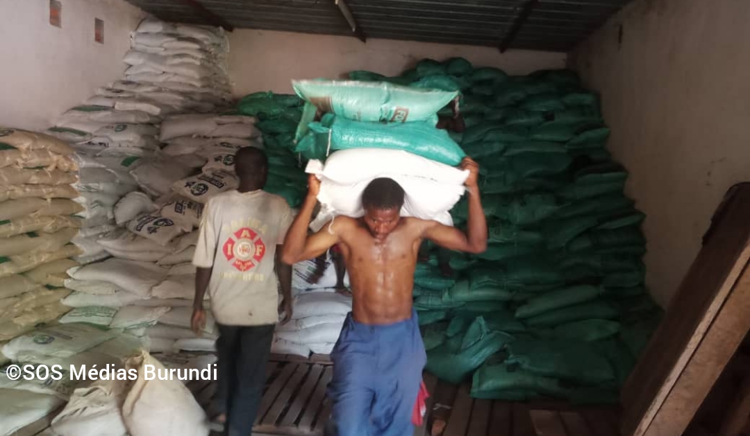 Photo d’illustration : un homme sort des sacs d’engrais chimiques d’un dépôt à Bubanza dans l’ouest du Burundi © SOS Médias Burundi