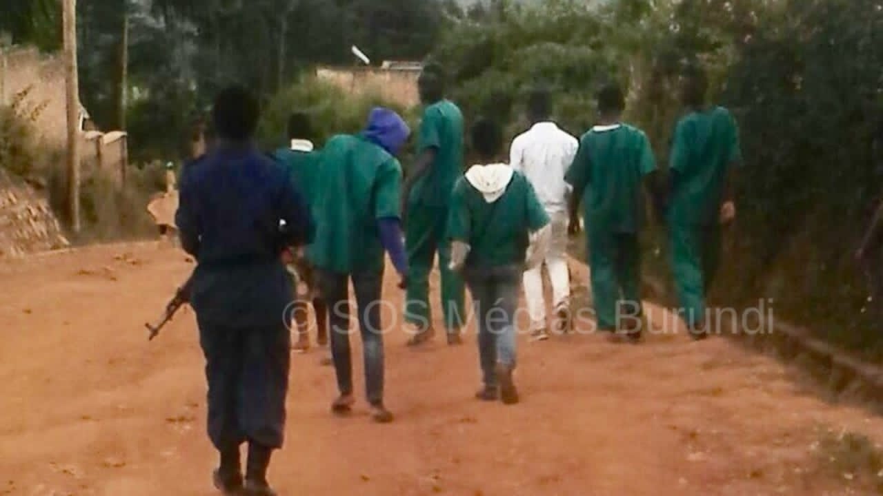 Photo : un policier escorte des détenus à la prison de Muramvya dont des élèves poursuivis pour avoir gribouillé la photo de feu président Pierre Nkurunziza dans des manuels scolaires, juin 2016 © SOS Médias Burundi