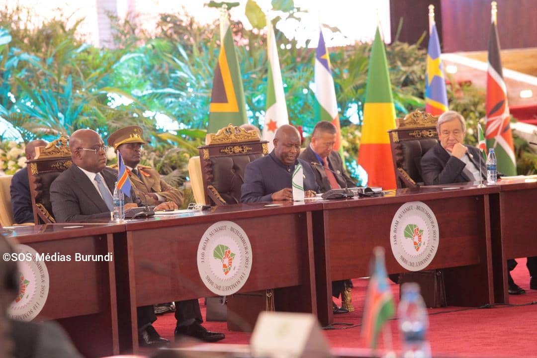 Marais wa Kongo na Burundi Félix Tshisekedi na Évariste Ndayishimiye, na Katibu Mkuu wa Umoja wa Mataifa António Guterres katika mkutano wa kilele kuhusu mgogoro wa Kongo katika mji wa kibiashara wa Burundi-Bujumbura, Mei 2023 (SOS Médias Burundi)