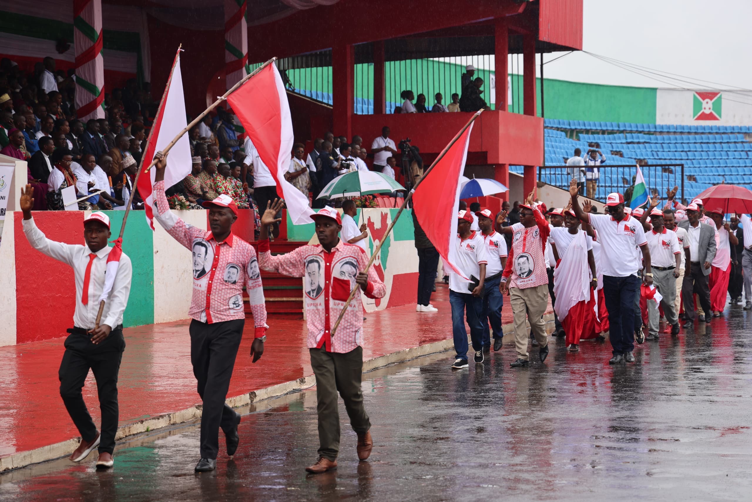 Wanaharakati kutoka chama kinachounga mkono serikali cha Uprona wakiandamana mbele ya Rais Neva kwenye uwanja wa michezo wa Ingoma huko Gitega, Mei 9, 2025, DR.