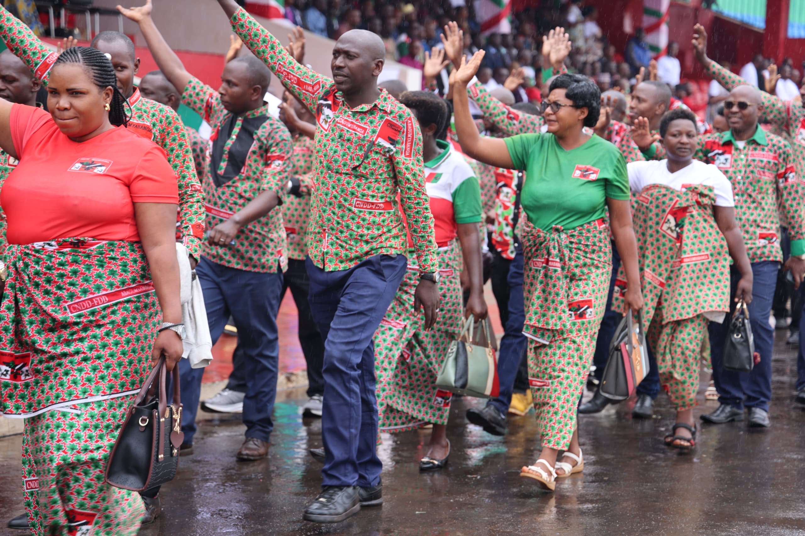 Wanaharakati wa CNDD-FDD wakiandamana kupitia uwanja wa michezo wa Ingoma huko Gitega wakati wa uzinduzi rasmi wa kampeni za uchaguzi wa wabunge na manispaa wa Juni 2025.